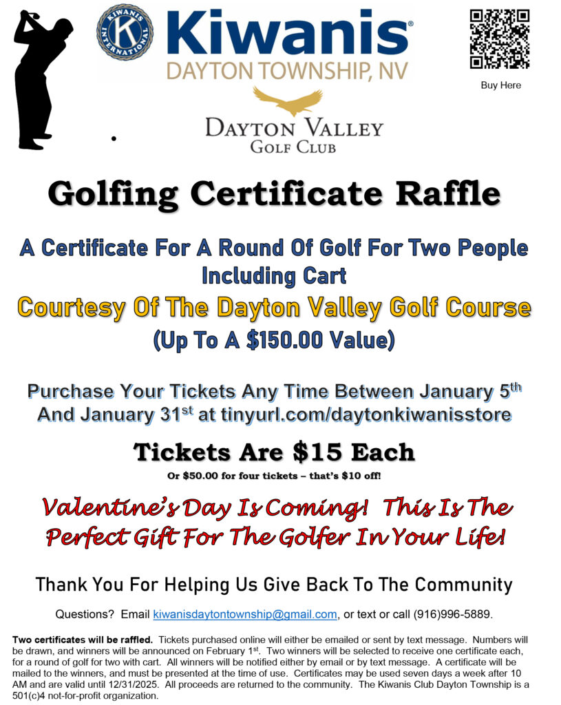3rd Annual Golf Certificate Raffle – Beginning January 3rd we will raffle off two certificates, each for a round of golf for two with a cart at the Dayton Valley Golf Club! A HUGE shout-out to Dayton Valley Golf Club for sponsoring this raffle! Winners will be announced February 1st. Look for us selling tickets in front of Grocery Outlet, or purchase them online.